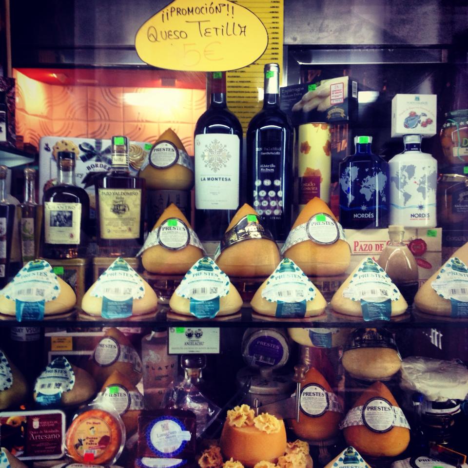 There are also local cheeses, such as queso tetilla. Tetilla in Galician means “small breast”, although another translation might be nipple cheese, due to the uncomplicated fact that the cheeses are shaped like a sort of pear-shaped cone topped by a nipple. The cow’s milk cheese is a common ingredient in Galician cooking and is often eaten as a dessert. They were frequently displayed in shop windows, on sale everywhere. (One sign even had the English translation: “cheese titty”. I didn’t make this up, I swear.)